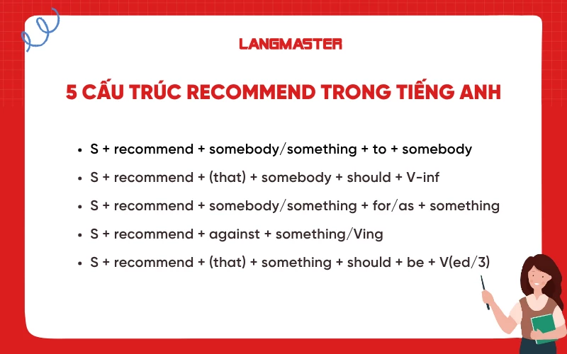 Recommend to V hay Ving? Sau recommend là gì? Đây là câu hỏi mà nhiều người khi học tiếng Anh gặp phải. Vậy khi nào chúng ta nên dùng “to V” và khi nào nên dùng “Ving” sau “recommend”? Hãy cùng Langmaster tìm hiểu cấu trúc recommend trong bài viết dưới đây.