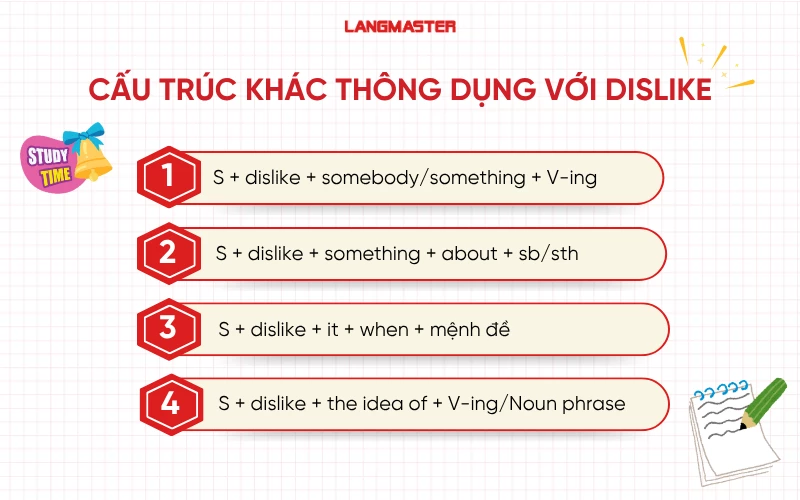 Ngoài cấu trúc cơ bản “dislike + V-ing”, trong giao tiếp và viết lách, “dislike” còn được sử dụng linh hoạt hơn trong nhiều dạng cấu trúc khác. Dưới đây là các mẫu câu phổ biến và chuẩn ngữ pháp: