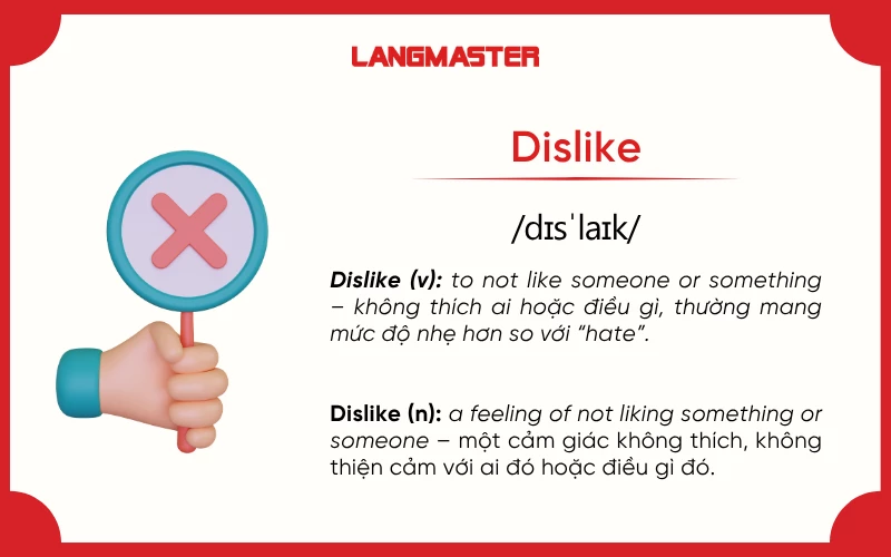 Dislike /dɪsˈlaɪk/ là một từ tiếng Anh vừa có thể đóng vai trò là động từ (verb) vừa là danh từ (noun), diễn tả cảm xúc không thích, ghét, hoặc có ác cảm với một người, sự vật hoặc tình huống nào đó. Tùy vào vị trí và cách sử dụng trong câu, “dislike” mang nghĩa cụ thể như sau:
