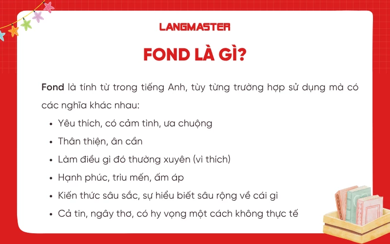 "Fond" là tính từ trong tiếng Anh biểu đạt “rất yêu thích, yêu mến ai, cái gì”. Xét về từng ngữ cảnh cụ thể, “fond” có thể dùng để thể hiện nhiều sắc thái tình cảm trong những tình huống khác nhau: