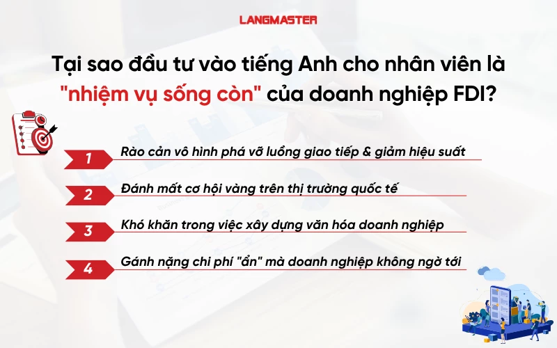 Trong bối cảnh toàn cầu hóa mạnh mẽ, năng lực tiếng Anh của đội ngũ nhân sự đã trở thành yếu tố then chốt, mang tính sống còn đối với mọi doanh nghiệp FDI. Không chú trọng đầu tư ngoại ngữ cho nhân viên có thể cản trở nghiêm trọng đến hiệu suất, sự gắn kết nội bộ và khả năng nắm bắt cơ hội trên thị trường quốc tế.