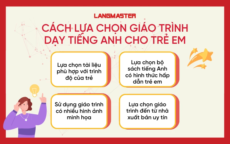 Việc lựa chọn giáo trình tiếng Anh phù hợp cho trẻ em là bước khởi đầu quan trọng giúp trẻ tiếp cận ngôn ngữ một cách tự nhiên và hiệu quả. Tuy nhiên, giáo trình cần phù hợp với độ tuổi, trình độ và tạo được hứng thú học tập. Do đó, khi lựa chọn giáo trình, phụ huynh cần lưu ý: