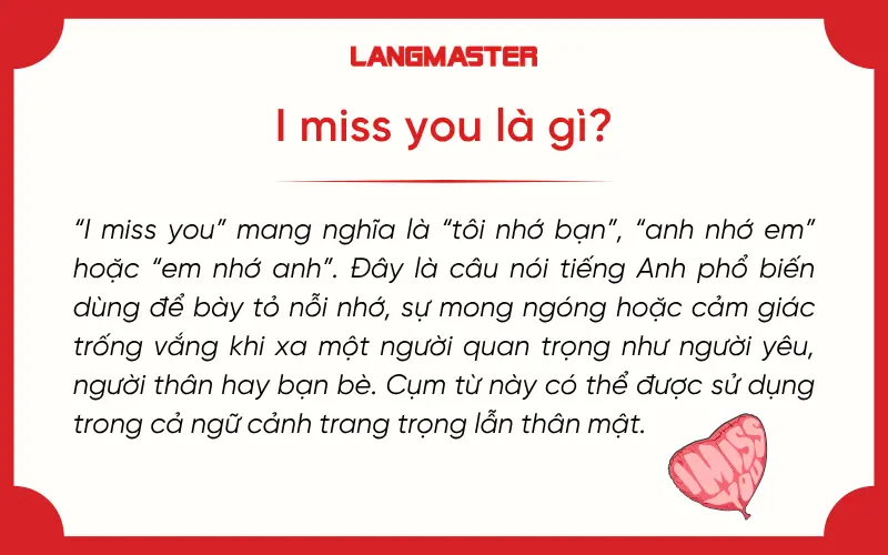 Trong quá trình học tiếng Anh, bạn sẽ thường xuyên bắt gặp câu “I miss you” trong giao tiếp hằng ngày, phim ảnh hoặc tin nhắn. Vậy “I miss you” nghĩa là gì và nên dùng trong những tình huống nào để đúng ngữ cảnh? Trong bài viết dưới đây, Langmaster sẽ giúp bạn hiểu rõ ý nghĩa, sắc thái khi dùng với bạn bè/người yêu, cùng ví dụ cụ thể để áp dụng tự nhiên trong thực tế.