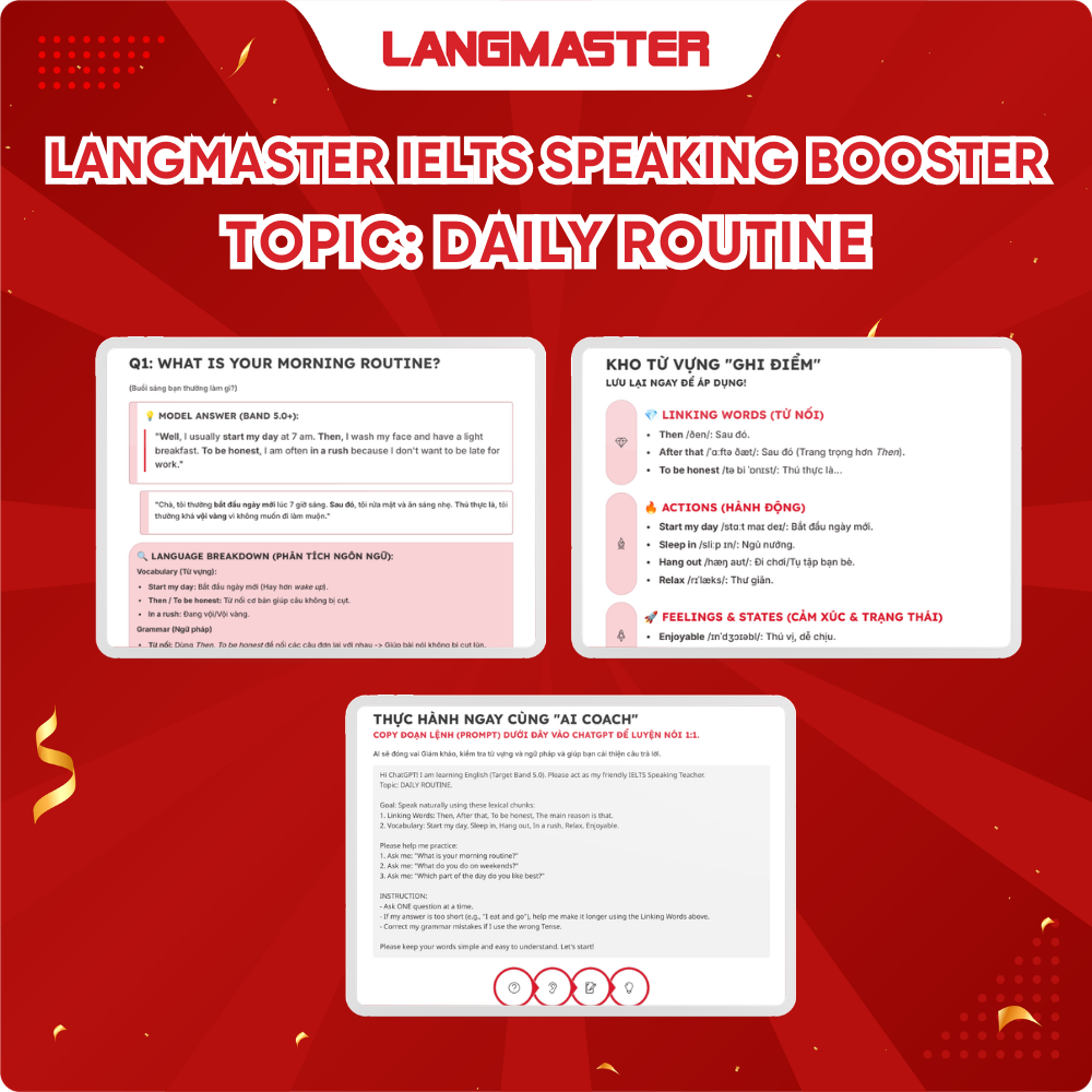 Bạn hay ngắc ngứ, đáp cụt lủn khi gặp chủ đề Daily Routine? Langmaster IELTS Speaking Booster mang đến giải pháp trọn gói: từ vựng trọng tâm, cấu trúc kéo dài câu và bài mẫu chi tiết. Bộ công cụ đắc lực giúp bạn gỡ rối tư duy, phản xạ tự nhiên và nắm chắc band 5.0+ Speaking!