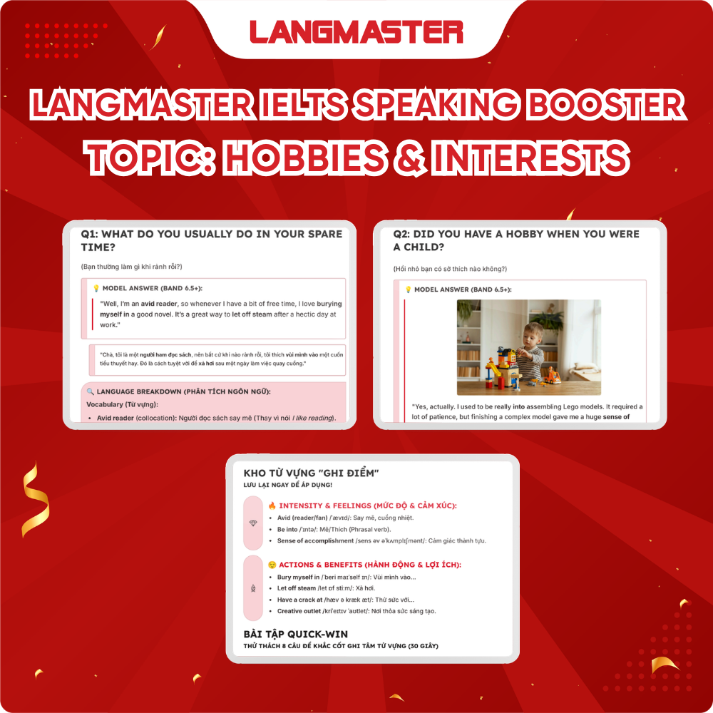 Chán ngấy việc lặp đi lặp lại "I like" trong phòng thi? Langmaster IELTS Speaking Booster: Hobbies & Interests sẽ giúp bạn "lột xác" vốn từ! Với kho từ vựng nâng cao, cấu trúc thay thế cực chất và câu trả lời mẫu sát đề, đây là bí kíp thực chiến để ghi điểm ấn tượng và chinh phục band 6.5+ Speaking.