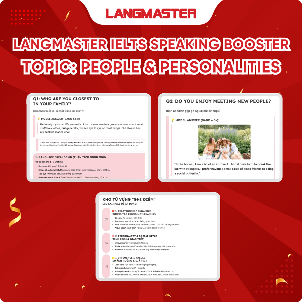 Bạn bí ý tưởng khi tả người trong IELTS Speaking? Langmaster IELTS Speaking Booster: People & Personalities chính là giải pháp! Khám phá kho từ vựng nâng cao, idiom đắt giá và bài mẫu thực chiến để lột tả tính cách đa chiều, ấn tượng. Tự tin chinh phục band 6.5+ ngay hôm nay!