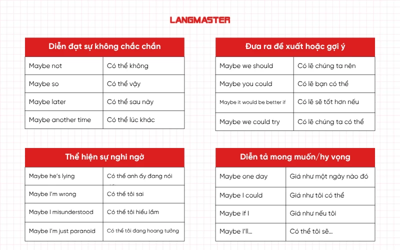 Từ “maybe” xuất hiện rất thường xuyên trong hội thoại tiếng Anh, đặc biệt trong các cụm từ thể hiện sự không chắc chắn, gợi ý, nghi ngờ hoặc mong muốn. Việc ghi nhớ những cụm từ quen thuộc đi với “maybe” sẽ giúp bạn phản xạ tiếng Anh tự nhiên hơn trong các tình huống hàng ngày.
