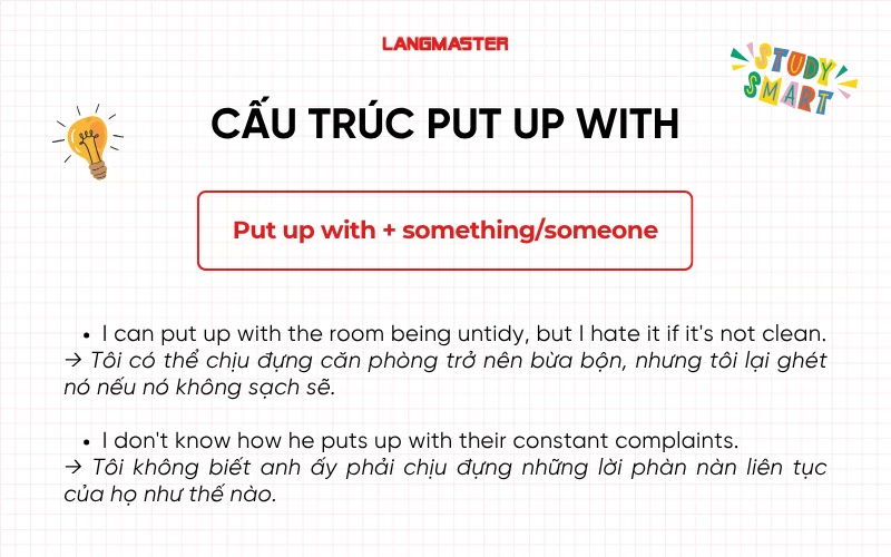 Cụm động từ put up with luôn đi kèm với một danh từ (noun) hoặc đại từ (pronoun) chỉ người hoặc sự việc mà bạn đang phải chịu đựng.