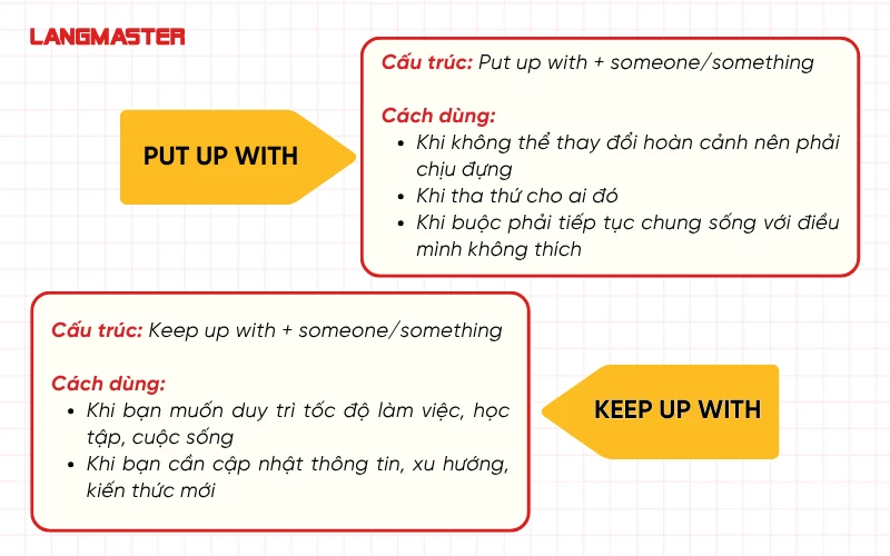 Mặc dù put up with và keep up with đều là cụm động từ có kết cấu tương tự (động từ + giới từ + with), nhưng ý nghĩa và cách dùng hoàn toàn khác nhau. Nếu bạn đang bối rối giữa hai cụm này, hãy xem bảng phân biệt dưới đây để hiểu rõ và sử dụng chính xác nhé!
