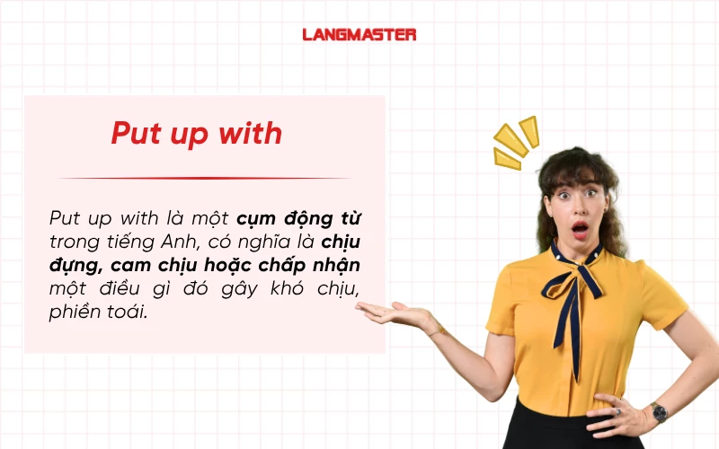 Put up with là một cụm động từ trong tiếng Anh, có nghĩa là chịu đựng, cam chịu hoặc chấp nhận một điều gì đó gây khó chịu, phiền toái. Thường dùng để nói về sự kiềm chế cảm xúc, sự không hài lòng nhưng vẫn tiếp tục chịu đựng thay vì cố gắng thay đổi tình hình.