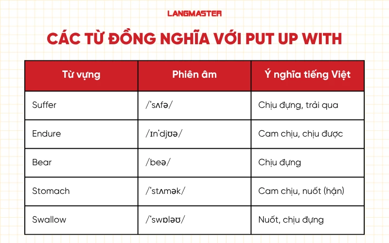 Ngoài cụm động từ put up with, tiếng Anh còn có nhiều từ và cụm từ khác mang nghĩa tương tự như chịu đựng, cam chịu, tha thứ, hoặc chấp nhận điều gì đó không dễ chịu. Langmaster đã tổng hợp danh sách các từ đồng nghĩa với put up with phổ biến, giúp bạn mở rộng vốn từ vựng và diễn đạt linh hoạt hơn trong giao tiếp: