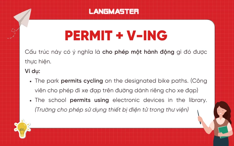 Khi diễn đạt cấu trúc “cho phép ai đó làm gì”, chúng ta thường sử dụng động từ “permit”. Tuy nhiên, nhiều người vẫn còn mắc lỗi khi sử dụng động từ đi kèm sau “permit” vì không biết chắc chắn permit to V hay Ving. Để tránh gặp tình trạng lúng túng khi gặp trường hợp này, Langmaster sẽ giúp bạn nắm được chính xác cách sử dụng “permit” nhé!