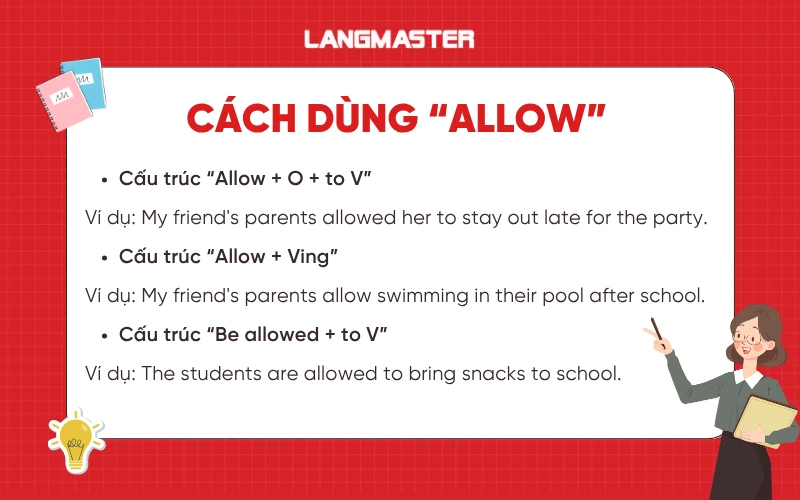 Allow có nghĩa là cho phép ai đó làm gì hoặc ngăn cản việc gì xảy ra. Tương tự như “permit”, “allow” được dùng trong 3 cấu trúc sau: