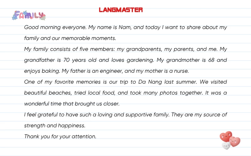 Chào buổi sáng mọi người. Mình tên là Nam, và hôm nay mình muốn chia sẻ về gia đình và những kỷ niệm đáng nhớ của chúng mình.