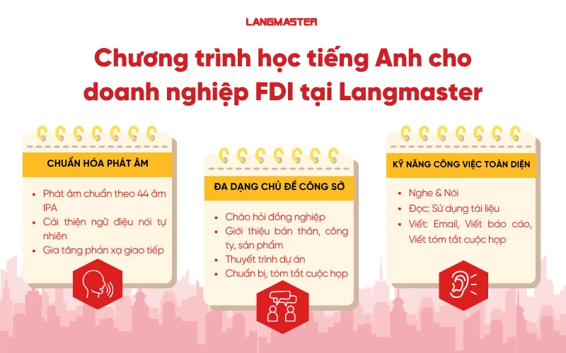 Chương trình học tiếng Anh tại Langmaster được thiết kế "đo ni đóng giày" cho từng doanh nghiệp FDI, đảm bảo phù hợp với đặc thù ngành nghề và mục tiêu phát triển. Chúng tôi tập trung phát triển toàn diện các kỹ năng cần thiết cho môi trường quốc tế, bao gồm: