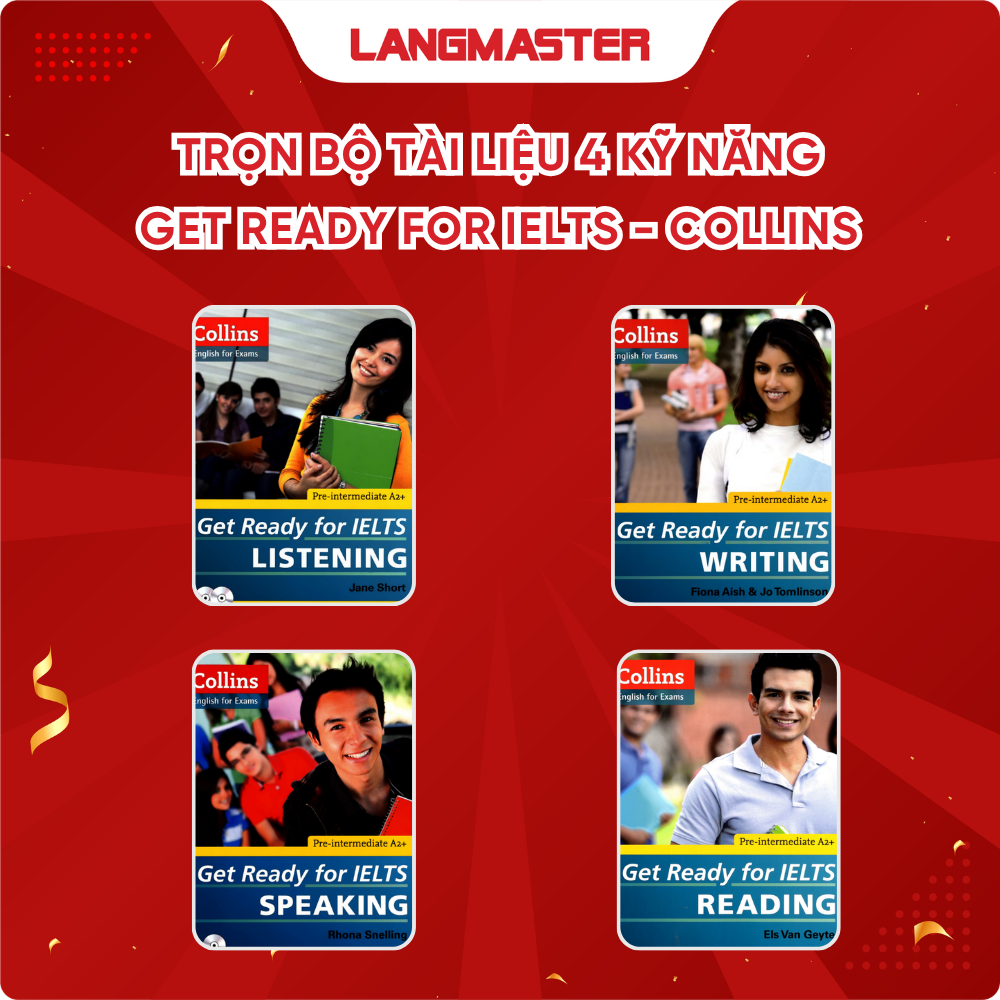 Trọn bộ Get Ready for IELTS (Collins) là tài liệu nền tảng dành cho người mới bắt đầu hoặc mất gốc, giúp làm quen với 4 kỹ năng Listening, Reading, Writing, Speaking theo format chuẩn IELTS. Nội dung được thiết kế dễ hiểu, đi từ cơ bản đến nâng cao, phù hợp cho người học từ band 0 → 4.5+. Mỗi bài học đều có hướng dẫn chi tiết, ví dụ minh họa và bài tập thực hành sát đề thi, giúp người học vừa nắm kiến thức vừa biết cách áp dụng. Đây là bộ tài liệu “nhập môn” lý tưởng để xây nền vững chắc trước khi bước vào giai đoạn luyện đề IELTS chuyên sâu.